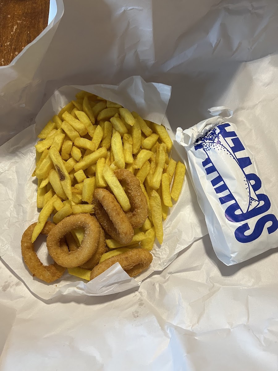 Yummy and super awesome local fish n chip shop. Lamb souvlaki was amazing, very tender meat and fresh pita. Also, the calamari were very nice, thin batter and very meaty. I loved the chips, crunchy on the outside and soft in the middle. The photo is of minimum chips, such a large portion! Highly recommended!